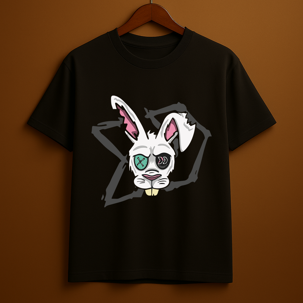The Glitch Bunny Tee is your new chaotic comfort fit. Featuring a cracked-out cartoon bunny with glitch eyes, offbeat lines, and full-on madness, this piece is a must-have for those who embrace weird with pride.